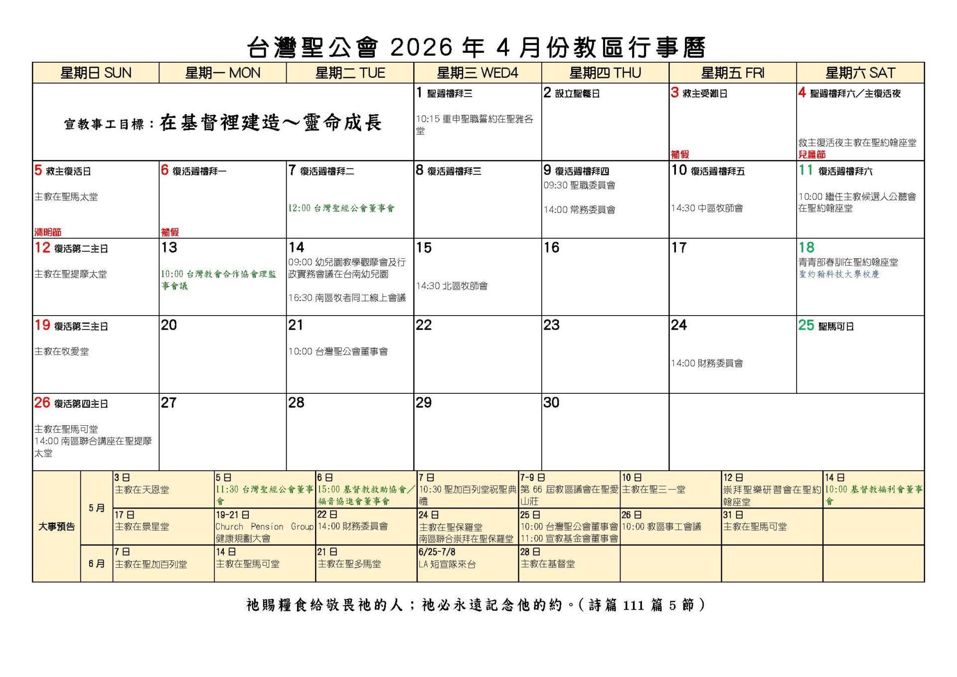 台灣聖公會2026年4月份教區行事曆