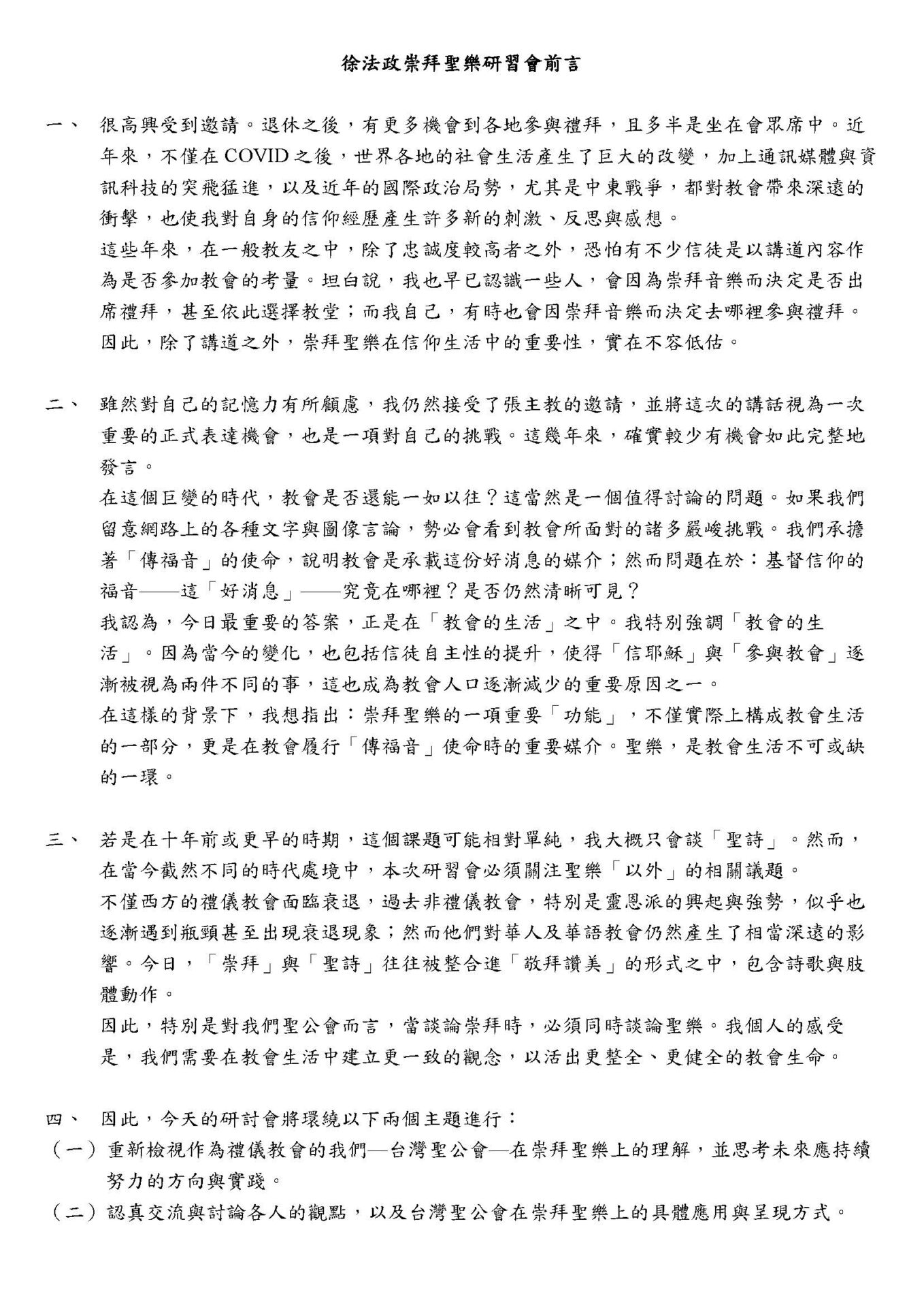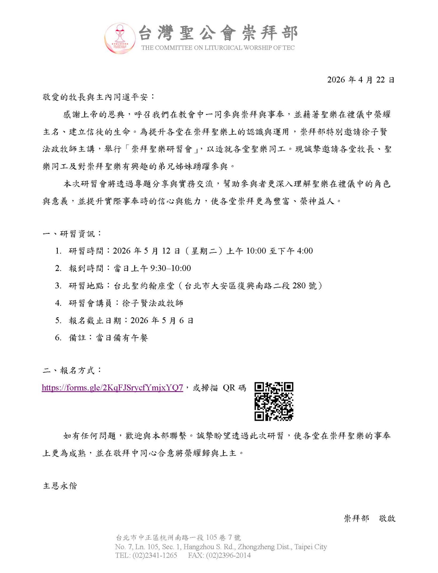2026年崇拜部崇拜聖樂研習會邀請信函